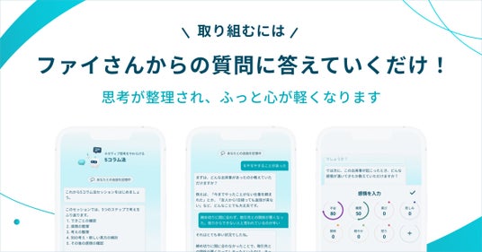 認知行動療法やマインドフルネスなど、科学的に根拠のある心理学の理論とAI技術をかけ合わせ、心の健康と成長をサポートするスマートフォンアプリです。これまで70万人以上の方をサポートしてきました。AIキャラクター「ファイさん」との対話機能や、自分の心のコンディションを分析する機能、マインドフルネス瞑想に取り組める音声ガイドや課題別の学習コースなど、メンタルヘルスケアに必要なコンテンツが300種以上揃っています。