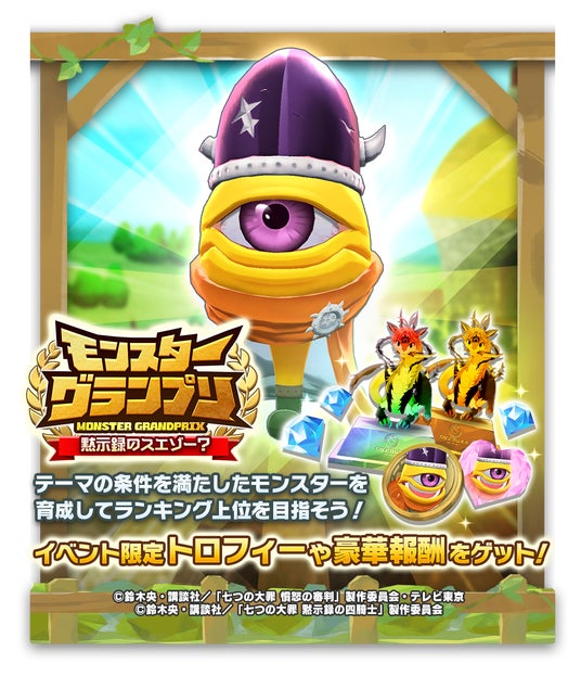 また、メリオダスたちがモンスターのブリーダーとしてモンスターファームの世界に登場するゲーム内イベント「七つの大罪 ~ゲルと時の結晶~」のほか、「モンスターグランプリ 黙示録のスエゾー?」やログインボーナスも開催します。
