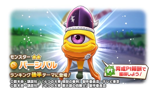 育成完了時には「育成PtI」がもらえます。育成Ptミッションでは、今回登場した新モンスター「メリオダス・魔神」と「エスカノール」を獲得できるチャンスがある「コラボフェス★3円盤石」や「七つの大罪コラボフェスチケット」が手に入るほか、報酬の所々に配されたパーシバルメダルは交換所で使用可能です。交換所では、黙示録の四騎士の主人公パーシバルに似た★2モンスター、スエゾー種パーシバルを再生する「パーシバル円盤石」も獲得できます。さらに、今月のWantedモンスター、シンリュウ種「メリオダス」に使える「メリオダスのハート」を100個用意しております。