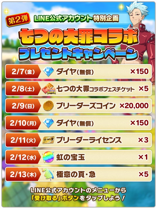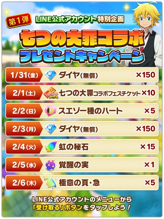 10日間ログインで「ダイヤ」が最大1,500個獲得できるログインボーナスを開催します。ログイン1日目に「SRメリオダス引換券」、2日目に「メリオダス円盤石」がもらえます。