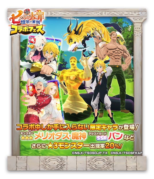 本コラボを記念して、『七つの大罪』をモチーフにしたコラボモンスターシンリュウ種「メリオダス・魔神」ゲル種「エスカノール」コラボアシストカード「【たしかなぬくもり】メリオダス」「【永遠の愛】バン」が手に入るガチャイベント「七つの大罪コラボフェス」を開催します。「七つの大罪コラボフェス」では、★3モンスターの出現確率が15%→20%にアップします。