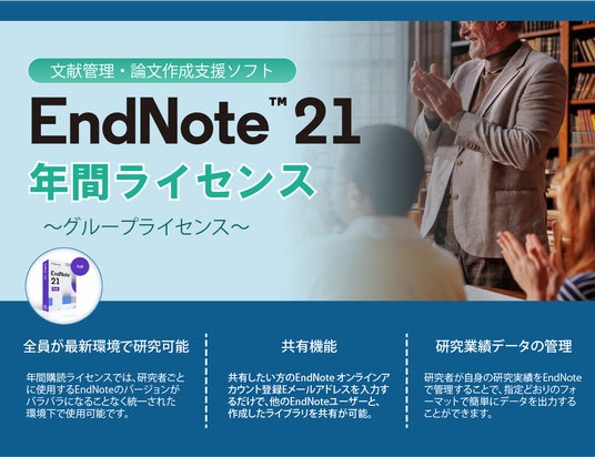 2025年2月10日、ユサコ株式会社(本社:東京都港区東麻布2丁目17番12号 代表取締役:山川 真一)は、「EndNote年間ライセンス」(5ライセンス以上のグループライセンス)のオンラインショップ販売を開始しました。これまで煩雑になりがちであった購入手続きを、ユサコオンラインショップでも受け付けることにより手続きの簡素化を実現します。商品、お手続きの詳細については https://www2.usaco.co.jp/shop/c/cENan/ にてご確認いただけます。