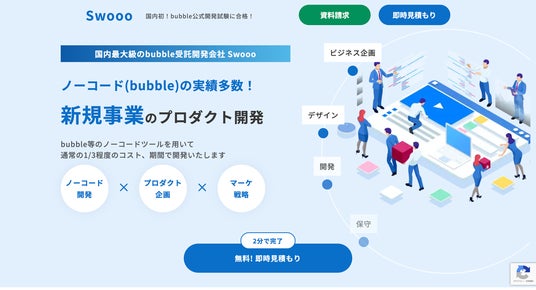 ノーコード受託開発「Swooo」は、「コーディング不要のノーコードツールbubbleを活用し、従来よりもコストを抑え、そして早く実現させる」webシステム開発サービスです。
