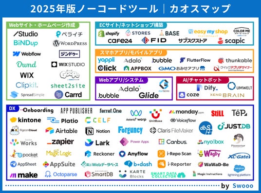 このような状況を踏まえ、弊社(合同会社ゼロイチスタート)は、2025年度版の「ノーコード開発ツール」のカオスマップを公開することにしました。業界全体の把握やツール選定をする際にお役立ていただけますと幸いです。