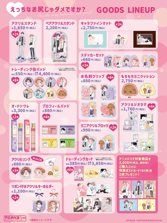 株式会社coly(本社:東京都港区赤坂、代表取締役:中島杏奈)が運営する「アニメバコ」(https://www.animebako.com/)は、株式会社海王社(本社:東京都千代田区、代表取締役:今晴美)の人気漫画『えっちなお尻じゃダメですか?』(著:鳩屋タマ)の描き下ろしイラストを使用した商品の販売や、各種キャンペーンを実施することをお知らせいたします。