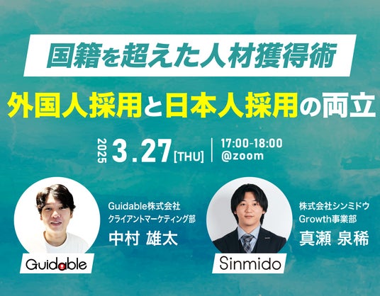本セミナーでは、日本人採用を支援する株式会社シンミドウと、外国人採用のプロフェッショナルであるGuidable株式会社が共同で、最新の採用市場の動向や具体的な成功事例を交えながら、効果的な採用戦略について解説します。