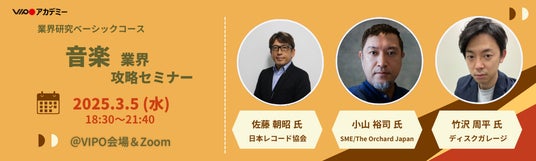 特定非営利活動法人映像産業振興機構(略称:VIPO[ヴィーポ]、理事長:松谷孝征、東京都中央区)の事業「VIPOアカデミー」では、コンテンツ業界の基礎知識を横断的に学べる「業界研究ベーシックコース」(全7回)を開催しています。今回は本コースの最終講座「音楽業界」攻略セミナーをご案内いたします。約3時間の講座内で「業界分析」「事例研究(2社)」「ネットワーキング(※会場参加者のみ)」を行い、業界のマーケットやビジネスモデルと現状を学び、課題を考察することで、業界の全体像を1日で学ぶことができます。この機会にぜひ、ご参加ください。