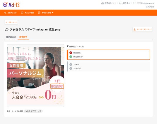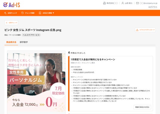 『Ad-IS』は、広告審査業務の負担を減らしたい企業向けに、複雑な審査項目もAIが景品表示法のチェックポイント、誤字脱字・矛盾点を自動的に指摘し、広告審査の負荷を減らし、効率的な広告規制対応を支援するサービスです。