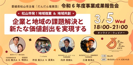 株式会社パソナJOB HUB(本社:東京都港区、代表取締役社長 高木 元義)は、愛媛県松山市から受託する「令和6年度だんだん複業団※(都市部人材デュアルワーク支援事業)」の成果報告会『松山市発!地域複業&地域共創企業と地域の課題解決と新たな価値創出を実現する』を3月5日(水)にオンラインにて開催いたします。