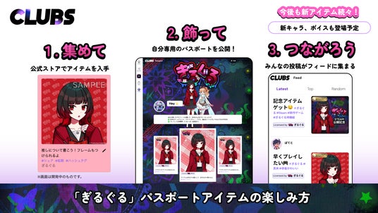 『CLUBS(クラブス)』 は、好きなゲームやアニメのアイテムを集めて飾れるコレクション型SNSです。自分専用のパスポートにお気に入りを記録して、ポケットに入るデジタル推し活を楽しもう!