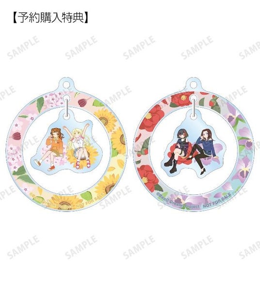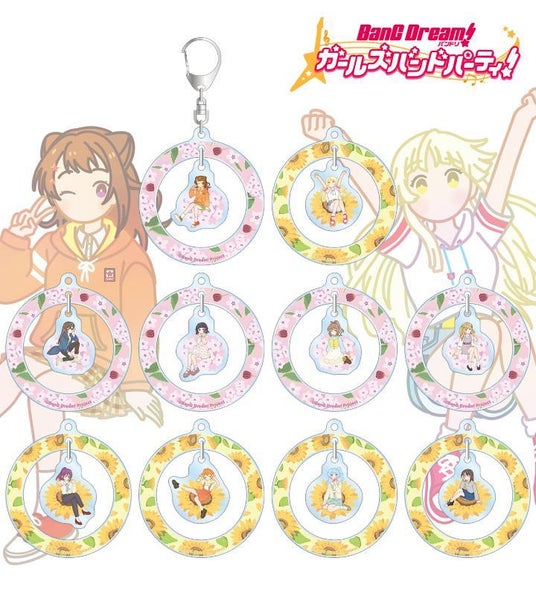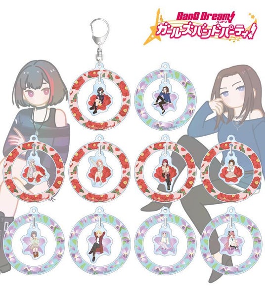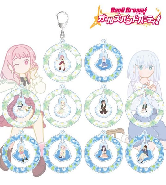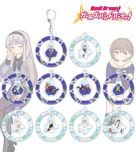 戸山 香澄、花園 たえ、牛込 りみ、山吹 沙綾、市ヶ谷 有咲、弦巻 こころ、瀬田 薫、北沢 はぐみ、松原 花音、奥沢 美咲のイラストをボタニカルデザインに落とし込んで繊細なタッチで新たに描き起こし、ゆらゆら動くアクリルキーホルダーに仕上げました。