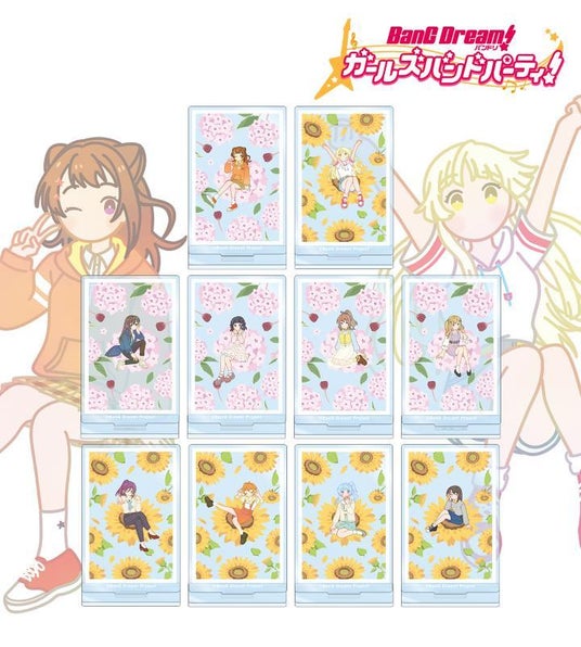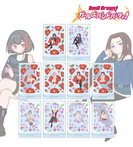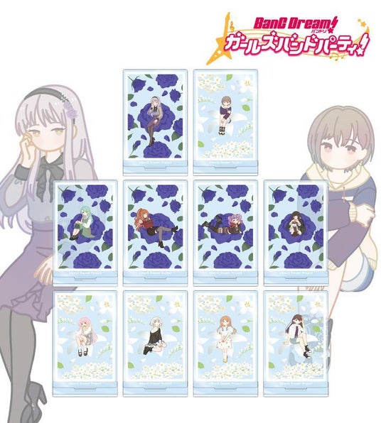 戸山 香澄、花園 たえ、牛込 りみ、山吹 沙綾、市ヶ谷 有咲、弦巻 こころ、瀬田 薫、北沢 はぐみ、松原 花音、奥沢 美咲のイラストをボタニカルデザインに落とし込んで繊細なタッチで新たに描き起こし、アクリルスタンドに仕上げました。