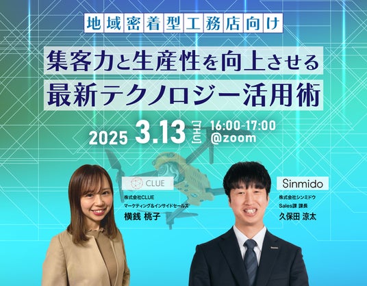 こうした背景を踏まえ、工務店様向けにドローンを販売する「株式会社CLUE」と、受注率向上を支援するツールを提供する「株式会社シンミドウ」がタッグを組み、本セミナーを開催することとなりました。 ドローンによる業務効率化と、営業支援ツールによる受注率向上の両面から、工務店様の生産性向上と売上アップをサポートします!
