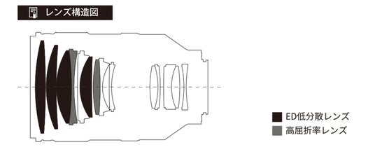 ・EDレンズ4枚、高屈折率レンズ2枚を含む9群14枚の構成により、焦点範囲全体にわたって中心から端まで鮮明さを確保し開放絞りでも細かい質感の描写を可能にすることで、切り取った画像でも細部まで画質を保持しユーザーの撮影の幅を広げます。