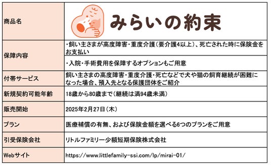 リトルファミリー少額短期保険株式会社(代表取締役:板谷 和彦 以下、リトルファミリー少短)は、株式会社PETOKOTO(代表取締役社長:大久保泰介 以下、ペトコト)と提携し、2025年2月27日(木)より飼い主さまの“もしも”のときに愛犬・愛猫の未来を守る保険「みらいの約束」の提供を開始します。