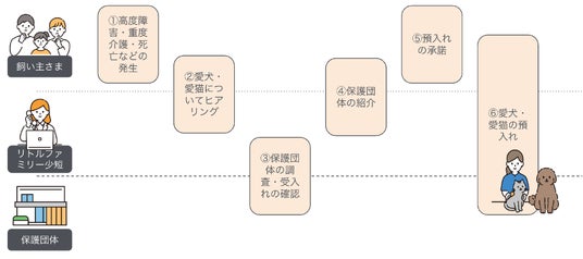 このような課題を解決するために、リトルファミリー少短は、飼い主さまが高度障害や重度介護状態、死亡などで愛犬・愛猫を育てられなくなった際、提携先の保護団体を紹介することで、飼い主さまやご家族が愛犬・愛猫を安心して託せるサービスを提供します。