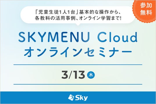 Sky株式会社では、児童生徒1人1台の学習活動端末支援Webシステム「SKYMENU Cloud」の基本的な使い方や教科指導、オンライン学習における活用例のご紹介など、毎月複数のテーマを設けてオンラインセミナーを開催しています。