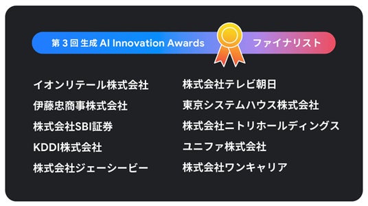 「生成 AI Innovation Awards」は、Google の AI、Gemini や Google Cloud の生成 AI サービスを活用した企業の革新的な取り組みを表彰し、未来の可能性を探る場として開催され、「第 3 回」となった今回は、多数の応募の中から書類選考、1 次選考を通過した 10 社がファイナリストとして選出されました。2025 年 3 月 13 日(木)に開催される「 AI Agent Summit ’25 Spring」にて審査結果が発表される予定です。