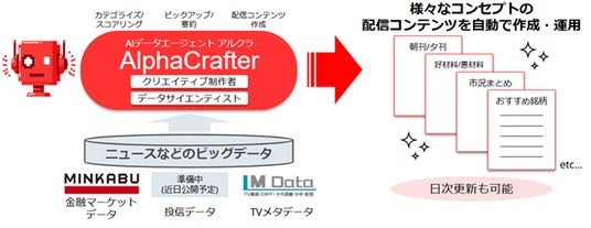 「AlphaCrafter(アルクラ)」はビッグデータから配信コンテンツ、クリエイティブを自動生成し、デジタルマーケティングの高度化・効率化を通じて、収益向上に寄与するサービスです。「アルクラ」はデータサイエンティストとクリエイティブ制作者の2面性を持つAIエージェントです。データサイエンティストとしての「アルクラ」は金融ニュースをはじめとするリアルタイムのマーケットデータをクライアント様の趣向に合わせてカテゴライズ&スコアリングし、顧客の興味を引く順にピックアップすることや、要約を出すなどのタスクから、さらに踏み込んだデータ分析を行うことが可能です。