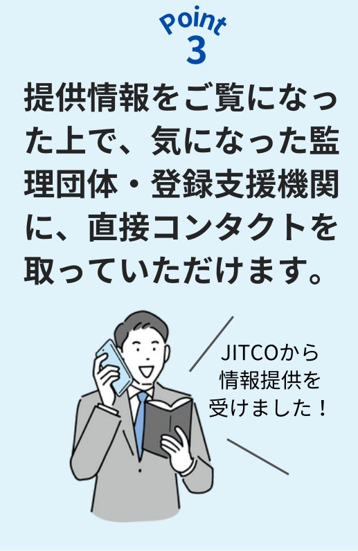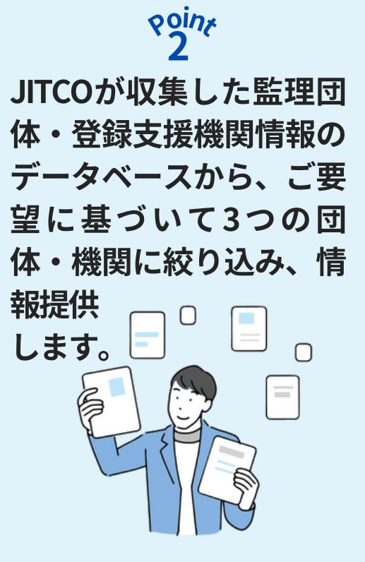 そこで33年にわたり、技能実習・特定技能制度と共に歩んできたJITCOが、利用したい制度や職種、活動地域などの詳しい条件を伺い、要望に沿う登録済みの監理団体や登録支援機関について情報を提供します。