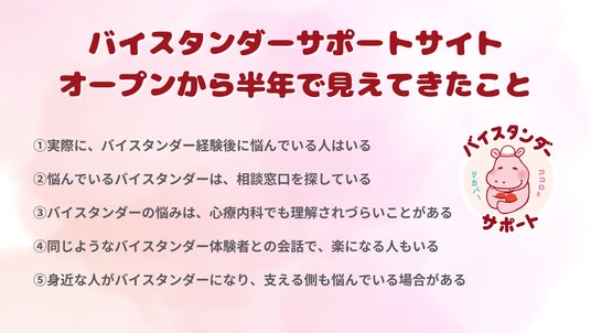 「バイスタンダーサポートサイト」は、3月9日にサイトオープンから半年を迎えます。この取り組みが、より広く知られることで、さらに多くのバイスタンダーがサポートを受けられるようになると考えます。ぜひ、この重要なテーマについて取材していただけましたら幸いです。