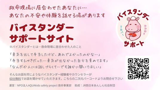 NPO法人AQUAkids safety project(救命事業部)が、JR西日本あんしん社会財団の助成を受け、2024年9月9日「救急の日」に開設した「バイスタンダーサポートサイト」は、まもなくオープンから半年を迎えます。この半年間で、救命現場に居合わせた人(バイスタンダー)の心のケアの必要性が改めて浮き彫りとなりました。
