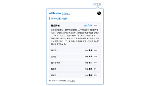 「AIレビュー」は、QiitaやZennに掲載されている記事を分析し、ITエンジニアにとって有益かどうかを5つの観点(「論理性」「実用性」「読みやすさ」「独自性」「明確性」)で評価する機能です。記事をより良いものにするための具体的な改善ポイントを提示し、ユーザーの成長を支援します。