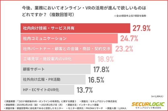 再び全員に、「今後、業務においてオンライン・VRの活用が進んで欲しいものはどれですか?(複数回答可)」と質問したところ、『社内向け技術・サービス共有(27.9%)』と回答した方が最も多く、次いで『社内コミュニケーション(24.7%)』『社外パートナー・顧客との会議・商談・契約交渉(23.2%)』『工場見学・施設案内のVR化(18.9%)』となりました。