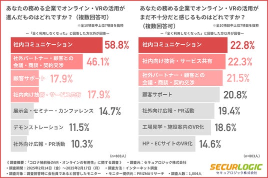 しかしながら、「社内コミュニケーション」や「社内向け技術・サービス共有」「社外パートナー・顧客との会議・商談・契約交渉」などでオンライン・VRの活用が不十分だと感じる方もおり、さらなる改善を求めていることがわかりました。