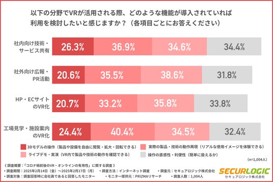 VRを活用する際は、どの分野でも「情報の分かりやすさ・視覚的な説明力」といった要素が最も重視されており、また、「ライブデモ・実演」や「実際の製品・技術の動作再現」などの機能があれば利用を検討したいと思うことが示されました。