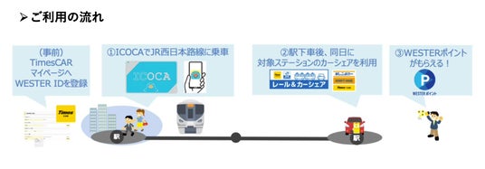 この度新たに開始するのは、ICOCA を利用して JR 西日本の在来線に乗車した後、JR西日本沿線の「駅レンタカー smart west」または「タイムズカー」の対象ステーションを利用すると、WESTER ポイント 100 ポイントがもらえる優待サービスです。