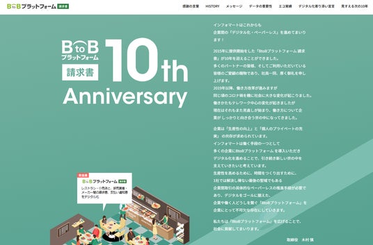 「BtoBプラットフォーム 請求書」はサービス提供10周年を迎えました。これもひとえに、ご利用いただいているお客様、パートナー企業の皆様等、多くのご支援の賜物であり、心より感謝申し上げます。