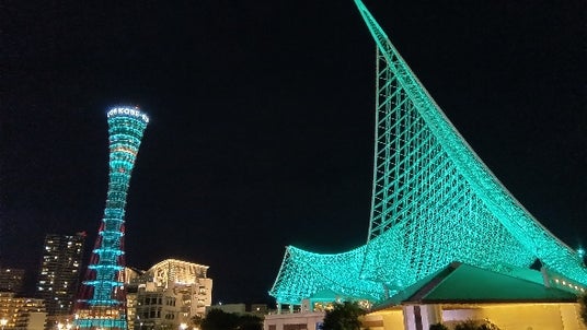 ※18 時 45 分~21 時 45 分までの毎時 15 分/45 分は「KOBE Night Mirage ー Sound and Light Show ー」(約5分間)が実施されます。その間、緑色ライトアップは停止します。