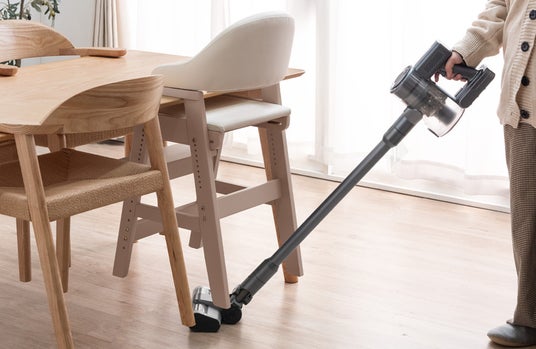 天板にアームをかけてお掃除ロボットや掃除機がかけやすいキッズハイチェア