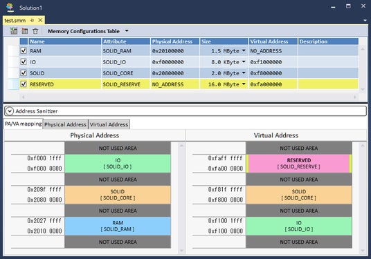 組み込みソフトウエア開発者は、開発環境のGUI上の簡単な操作で、MMUの物理アドレス・論理アドレスのマップを作成します。開発環境側では、MMUマップからテーブルを生成し、コンパイル時にそのテーブルに従い、MMUを初期化するためのランタイムを自動生成し、プログラム実行時に指定された通りのMMU設定を初期化プログラムとして実行します。