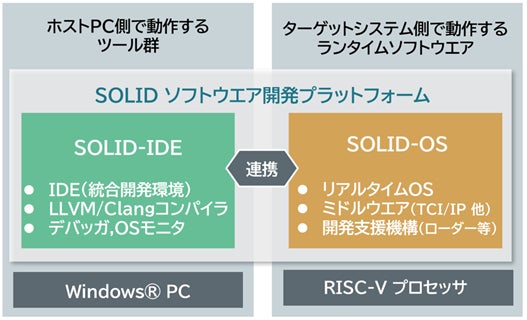 「SOLID」は、ソフトウエア開発環境とランタイムソフトウエアが連携し、自動バグ検出や分割開発機能など、大規模組み込みソフトウエアを安全に開発するための機能が特徴です。今回、「SOLID」がRISC-Vに対応することで、既存のArm(R)プロセッサ向け組み込みソフトウエアを開発する際の機能や使い勝手に匹敵する開発環境をRISC-Vにおいても利用できるようになります。これにより、新たにRISC-Vプロセッサを採用した際の開発環境習得時間の大幅な削減と、導入コスト低減に貢献します。