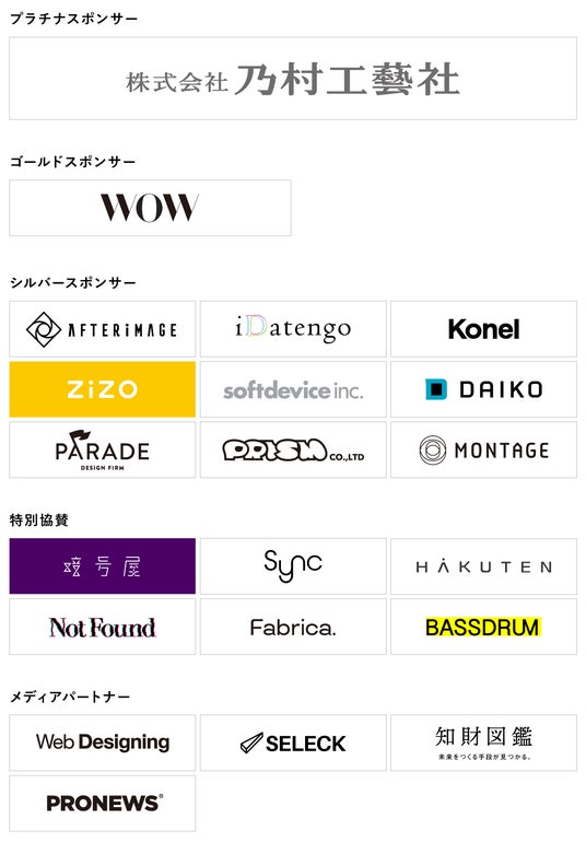 [プラチナスポンサー] 株式会社乃村工藝社 [ゴールドスポンサー] ワウ株式会社 [シルバースポンサー] 株式会社Afterimage、株式会社iDatengo、株式会社コネル、株式会社ZIZO DESIGN、株式会社ソフトディバイス、株式会社 大広、PARADE Design Firm、株式会社プリズム、株式会社モンタージュ [特別協賛] 合同会社 暗号屋、sync.dev、株式会社博展、株式会社NOT FOUND、株式会社ファブリカ、ベースドラム株式会社 [メディアパートナー] Web Designing、SELECK、知財図鑑、PRONEWS