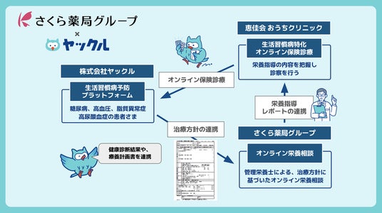 生活習慣病の改善には、薬物療法に加え継続的な食事療法が重要です。この度、生活習慣病に特化した株式会社ヤックルと全国に調剤薬局を展開するさくら薬局グループがパートナーシップを締結し、医師による治療と薬局の管理栄養士によるオンライン栄養相談の連携が可能となりました。医師が作成する生活習慣病療養計画書の方針に沿った個別のオンライン栄養相談を通して、一人ひとりの生活に合わせた献立の提案やアドバイスなど、食生活の改善をサポートします。