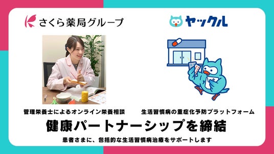 全国に調剤薬局さくら薬局グループを展開するクラフト株式会社は、生活習慣病の重症化予防プラットフォームを運営する株式会社ヤックルと「健康パートナーシップ」を締結しました。株式会社ヤックルは、2023年12月にオンライン診療サービス ヤックル(以下「ヤックル」)の運営を開始し、2025年1月から生活習慣病を治療する患者さまへ、当社管理栄養士によるオンライン栄養相談を提供しています。医師による生活習慣病療養計画書の方針に沿った、オーダーメイドな栄養相談を実現します。