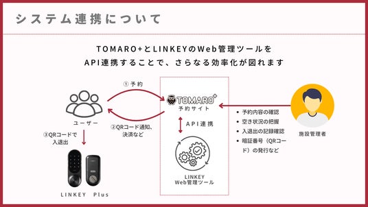 TOMARO+のオンラインチェックイン機能とLINKEY PlusのWeb管理ツール「Finelife」が連携。宿泊予約時に発行された情報をもとに、ゲストがTOMARO+でチェックインを完了すると、自動的にFinelifeがゲスト専用の鍵情報を発行し、スマートフォン上で通知されます。これにより、ゲストはフロントを経由せずにスムーズに入室することが可能になります。