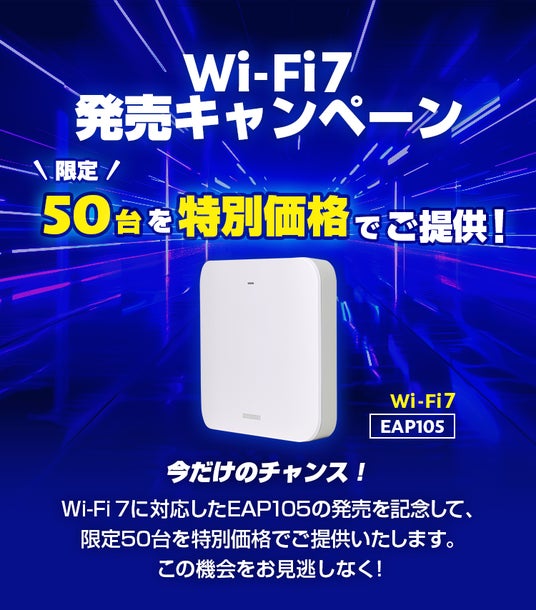 さらに、「EAP105」の新発売を記念し、期間・台数限定で「EAP105」を特別価格にてご提供するキャンペーンも実施いたします。Wi-Fi 7の最新かつ優れた機能をいち早く、お得な価格で導入していただける、またとない機会となります。ぜひ、当社担当部署までお問い合わせください。