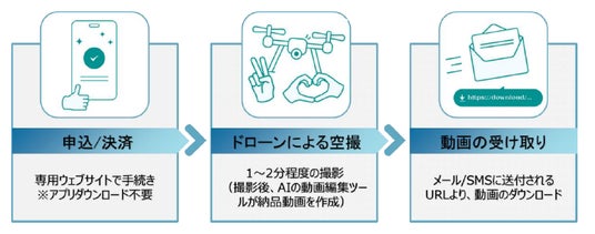本サービスは、通常では見ることはできない空からの視点で、誰でも気軽に動画撮影や視聴を楽しむことができる日本初のサービスとなります。設置されたQRコードをお客様のスマートフォンで読み込み、決済を行うとドローンが飛び立ち、空からの美しい景観とお客様を、事前にプログラミングされた最適なルートで自動撮影します。ドローンが撮影した映像はAIによって自動で編集され、高画質でインパクトのある映像がお客様のお手元に届きます。アプリをダウンロードする必要はなく、英語や中国語等の複数言語に対応しているため、海外のお客様も簡単にご利用いただけます。