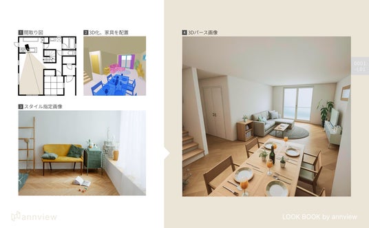 annview(アンビュー)は、AIのサポートにより誰でも簡単に間取り図から3Dパース画像が半自動で作成できるWebサービスです。従来の3D CAD等を使った手法と比較して制作コストの大幅な削減が可能で、最短数分でパース画像が作成出来ます。