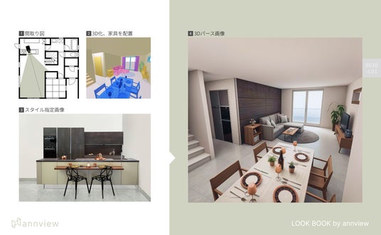 壁や家具などの色を一つ一つ指定するのは大変ですが、annviewでは好きなインテリア画像をアップロードして指定するだけで、そのスタイルを反映した画像を作成します。