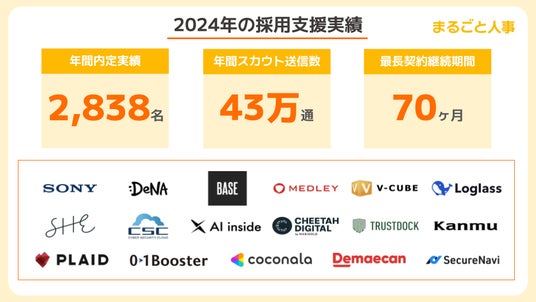 「まるごと人事」の実績としても2024年に内定者数2,838名、スカウト送信43万通を超えています。1ヶ月単位の契約ながら、最長のお客様では約6年にわたってご利用いただいています。