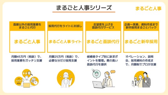 月額固定料金で、最短1ヶ月から採用業務のほぼ全般を代行するサービスです。 2017年に開始した「まるごと人事」に加え、低コストで部分的に依頼できる「まるごと人事ライト」や「まるごと面談代行」も提供しています。