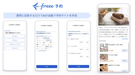 - 「freee予約」はスマートフォンから3分程度の質問に答えるとAIが予約サイトを自動作成し、24時間365日ネット予約受付が可能です