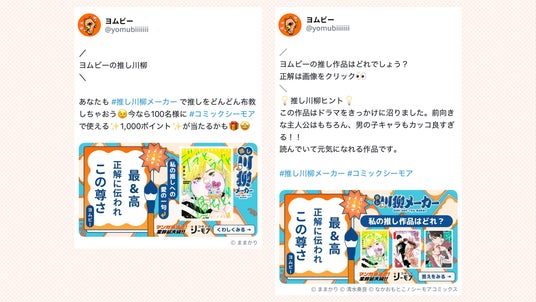 完成した川柳は、思い浮かべた「推し」がコミックシーモア内に存在している作品のものである場合、該当するマンガと共に表示されます。結果はSNSでシェアすることができ、シェア画像をクリックすることでコミックシーモアの作品が購入できるページに飛ぶこともできるため、友人や仲間たちに「推し」マンガやキャラクターとの新たな出会いを提供することができるのも魅力です。さらに、シェア方法には「アツい想い」や「推し作品とのエピソード」など、自分の情熱を込めた文章を添えてシェアすることができる「クイズ」形式も用意されており、「推し」の布教をよりエンターテインメント化することができます。