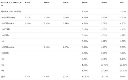 本セールガチャのレアリティ別、earnボーナス倍率別の排出確率は以下の通りです。