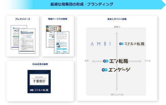 プレスリリースや特設ページ、Web広告での告知に加え、各求人サイトでの集客支援を実施。『エン転職』『エンゲージ』『AMBI』『ミドルの転職』とターゲットの異なる求人サイトを活用することで、ターゲットへ網羅的に求人を届けます。
